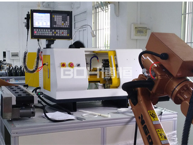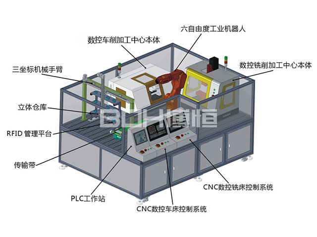 本套设备是以小型的柔性制造系统为载体,主要特点是占地空间小、操作安全、涉及的知识点丰富、综合,系统性强、成本低、师生容易上手等;主要是由一台工业6轴自由度机器人、一台三坐标机械手臂、一台柔性数控车床、一台柔性数控铣床、RFID系统、PLC工作站、智能仓库、中控台、传输带等部份组成,实现自动化上下料、加工等无人工作环节,机器人按指令分别给两台机器送料取料;该系统能够实现工业机器人上下料工作站系统的编程、上下料系统的集成、RFID系统应用、PLC系统编程、数控车床编程加工、数控铣床编程加工、现场总线的通讯实训等环节。让学生轻松掌握工业6轴机器人上下料与数控机床组建柔性加工生产系统,能满足学生对工业机器人学习及操作的需要,学生通过该套系统的学习与训练,对智能生产无人工厂的组建整体性应用有全面的了解与体验。