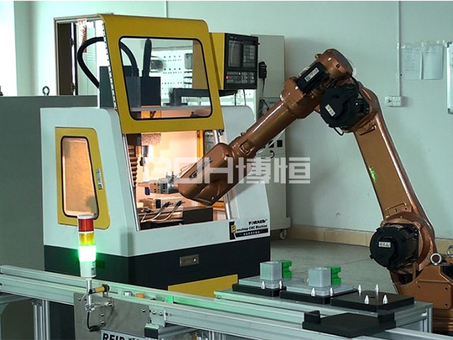三坐标机械手臂从原材料仓库取出原材料到传输线上,RFID系统读取数值,由传输线运送到6自由度工业机器人端,由负责数控机床的上下料工作,数控车削单元将零件加工完毕后,机床自动开门,零件由机器人送置到数控铣削加工中心进行加工下一道工序,加工完毕后铣床自动开门,由机器人取出成品零件送置到传输带上,输送到智能仓库端,由三坐标机械手臂将成品零件入库,RFID系统读取数值。学生在熟练掌握该系统的操作与编程以后,也可以对零件类型和加工工艺进行调整。