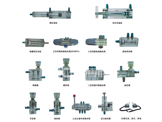 4、实训元件均为透明有机材料制成,便于了解掌握几十种常用液压元件的结构,性能及用途。掌握几十种基本回路的工作原理,实验组装回路快捷、方便。